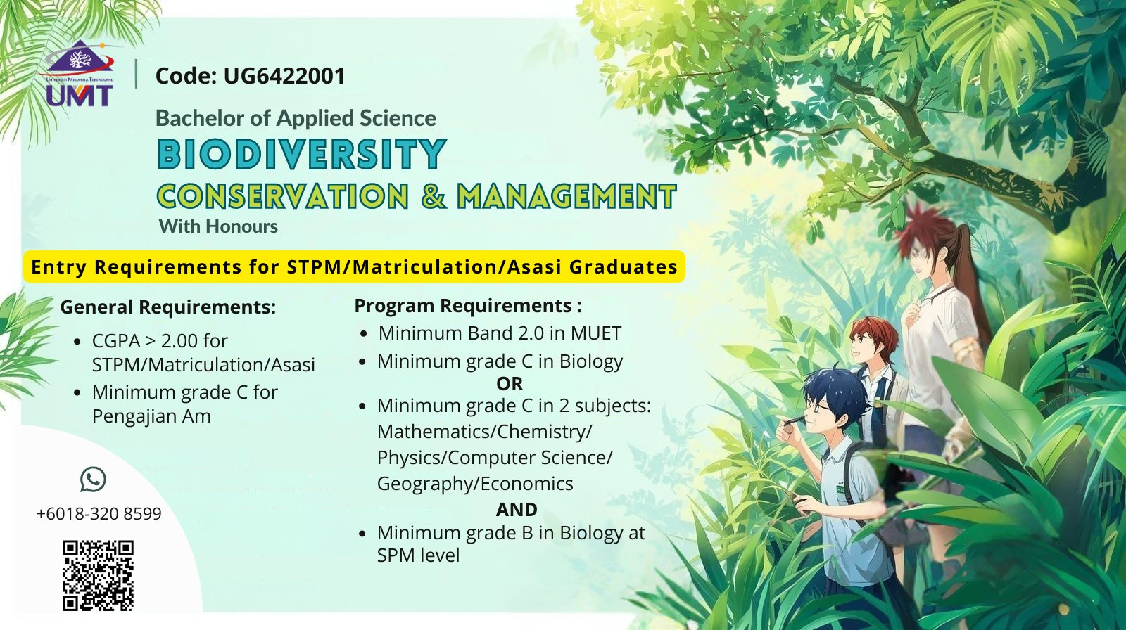 Beyond technical knowledge, students will also enhance soft skills such as critical thinking, problem-solving, teamwork, and communication, along with mastering ethical decision-making and professional techniques essential for career advancement. With a strong focus on scientific research, practical applications, and human-ecosystem interactions, graduates will be well-prepared to contribute to conservation efforts, environmental monitoring, and sustainable resource management in tropical and global landscapes.